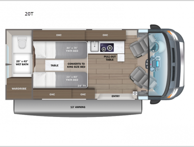 Sleeps 2 Length 20 ft 11 in Ext Width 6 ft 11 in Ext Height 9 ft 3 in Int Height 6 ft 2 in Interior Color Caribou Exterior Color Granite, Silver Hitch Weight 3500 lbs GVWR 9350 lbs Fresh Water Capacity 24 gals Grey Water Capacity 13 gals Black Water Capacity 12 gals Tire Size LT225/75R16E Furnace BTU 20000 btu Generator 2,800-watt Onan Fuel Type Gasoline Engine 3.6L V6 24V VVT Chassis Ram ProMaster 3500 Van Horsepower 276 hp Fuel Capacity 24 gals Wheelbase 159 in Available Beds Two Twin with King Conversion Torque 250 ft-lb Refrigerator Type DC Refrigerator Size 3.1 cu ft Convection Cooking Yes Cooktop Burners 2 Shower Size 25" x 43" Number of Awnings 1 LP Tank Capacity 20 lbs Water Heater Type Truma Combi Eco Plus AC BTU 13500 btu Awning Info 13' Thule Armless w/LED Light Strip Gross Combined Weight 12000 lbs Shower Type Wet/Bath Shower Electrical Service 30 amp Similar Motor Home Class B Floorplans