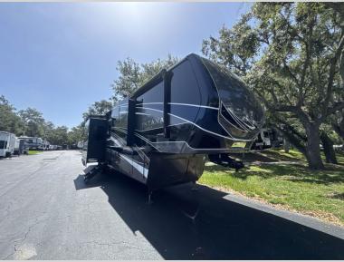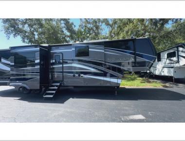 Sleeps 4 Slides 5 Length 42 ft 4 in Ext Height 13 ft 5 in Interior Color Oakmont, Woodcliff Exterior Color Volcano, Cobalt, Sterling, Glacier Full-Body Paint Choices Hitch Weight 2975 lbs Dry Weight 15063 lbs Cargo Capacity 2937 lbs Fresh Water Capacity 70 gals Grey Water Capacity 88 gals Black Water Capacity 88 gals Tire Size ST235/80R16G Furnace BTU 35000 btu Available Beds King Refrigerator Type Residential w/Ice Maker Refrigerator Size 18 cu ft Convection Cooking Yes Cooktop Burners 3 Shower Size 48" x 30" Number of Awnings 1 Axle Weight 7000 lbs LP Tank Capacity 30 lbs. Water Heater Capacity 16 gal Water Heater Type Gas/Electric Quick Recovery AC BTU 45000 btu TV Info LR 50" Smart TV, BR 32" LCD TV Awning Info 19' Electric with LED Lights Axle Count 2 Washer/Dryer Available Yes Number of LP Tanks 2 Shower Type Standard Electrical Service 50 amp Similar Fifth Wheel Floorplans