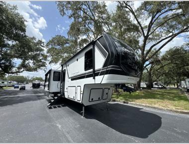 Sleeps 7 Slides 4 Length 42 ft 5 in Ext Height 13 ft 4 in Interior Color Arlington, Kingston Hitch Weight 2705 lbs Dry Weight 14451 lbs Cargo Capacity 2254 lbs Fresh Water Capacity 75 gals Grey Water Capacity 135 gals Black Water Capacity 98 gals Tire Size ST235/80R16G Furnace BTU 35000 btu Available Beds King, Queen Refrigerator Type GE Energy Star Residential with Ice Maker Refrigerator Size 18 cu ft Cooktop Burners 3 Shower Size 48" x 30" Axle Weight 7000 lbs LP Tank Capacity 30 lbs Water Heater Type On Demand AC BTU 15000 btu TV Info LR 50" LED Smart TV Awning Info Electric with LED Lights Axle Count 2 Washer/Dryer Available Yes Number of LP Tanks 2 Shower Type Shower w/Seat Electrical Service 50 amp Similar Fifth Wheel Floorplans