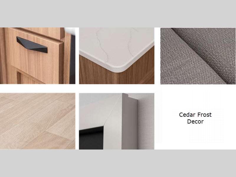 Each one is constructed with a seamless, laminated and gel-coated filon exterior, a fully walkable roof, and a high impact thermoset resin painted front cap for added protection. You'll love the residential and durable Beauflor® vinyl flooring inside, along with Cedar Frost interior decor and LED lights throughout. The exterior is just as accommodating with its outside shower, Edge View line lighting, plus power stabilizer jacks to name a few conveniences.