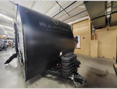Each Raptor Carbon Series toy hauler travel trailer is built with a 10" I-beam frame, and aluminum sidewalls, a SuperFlex roof membrane, and new sleek exterior graphics! There is also a lighted pass-through storage outside, along with a hot/cold shower, MORryde StepAbove entry steps, and an exterior convenience center for all your hookups. Head inside to find refreshed interior decor, pull-down window shades, soft-close hardwood cabinetry with hidden hinges, and pressed countertops to name a few comforts!