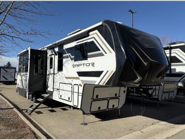 Experience a breath of fresh air with one of these Keystone RV Raptor fifth wheel toy haulers! Their rugged construction consists of a one-piece Alpha Super Flex TPO roof membrane, Dyna Span floor decking, and 5,000 lb. frame-welded tie- downs to keep your toys in place as you travel. Some unexpected conveniences you will appreciate include an Omni-Chill A/C system to keep you cool on those hot summer days, a Furrion backup camera, MaxTurn™ technology with a Helux™ pin box, and a Generation 3 iN-Command smart automation system with Global Connect to make life easier. There is also designer style vinyl flooring throughout, along with new ceiling treatment with LED accent lighting, beach wood and white cabinetry, and many more interior comforts!