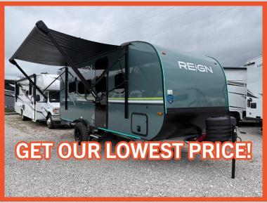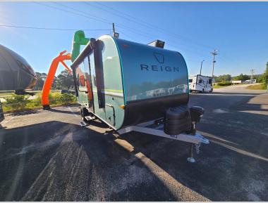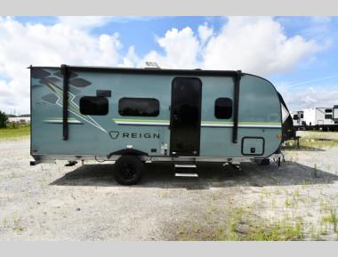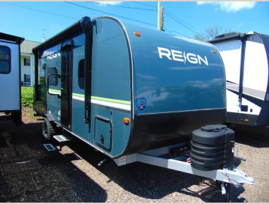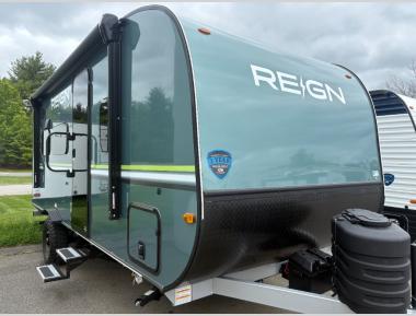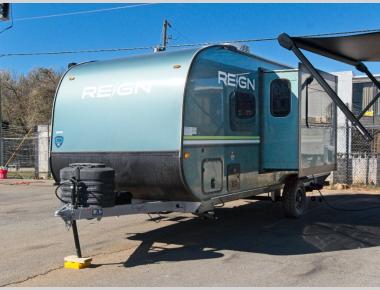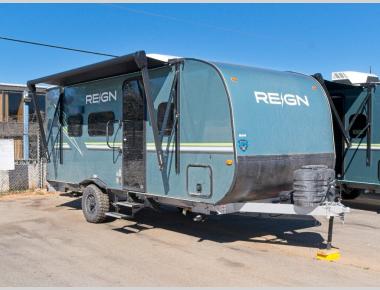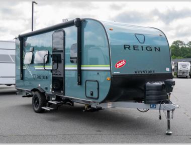 The Reign travel trailers by Keystone are premium single-axle units that are sure to make an impression at the campground. Each one is built with an exclusive automotive-finished aluminum exterior, a walkable roof, and a 100% composite floor for added durability. There are also tinted safety glass windows, quick drop stabilizer jacks, and an exterior shower with hot and cold water. The European inspired interior design is unique and cozy, and the 78" interior height will give you plenty of space to move about. You will also enjoy the ultra bright LED light strip and solid surface countertops in the kitchen, along with blackout night shades, and many more interior comforts.