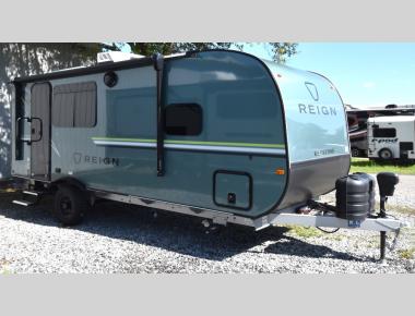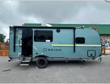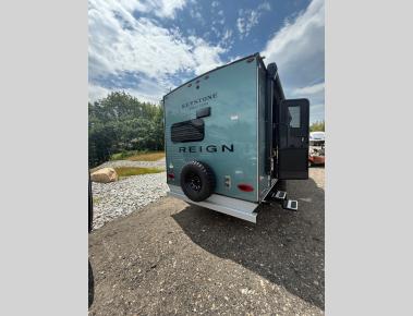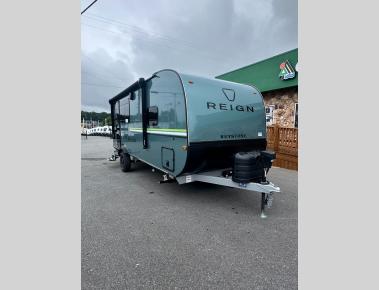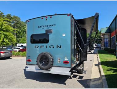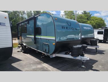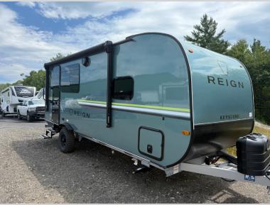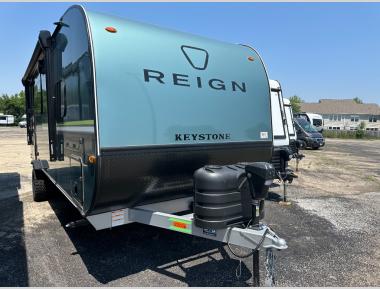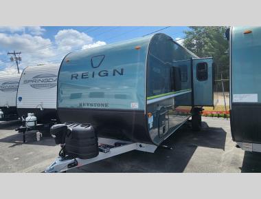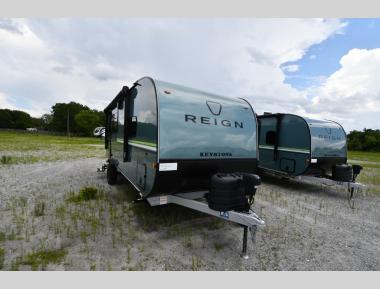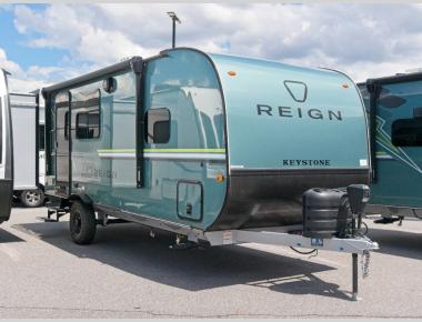 The Reign travel trailers by Keystone are premium single-axle units that are sure to make an impression at the campground. Each one is built with an exclusive automotive-finished aluminum exterior, a walkable roof, and a 100% composite floor for added durability. There are also tinted safety glass windows, quick drop stabilizer jacks, and an exterior shower with hot and cold water. The European inspired interior design is unique and cozy, and the 78" interior height will give you plenty of space to move about. You will also enjoy the ultra bright LED light strip and solid surface countertops in the kitchen, along with blackout night shades, and many more interior comforts.