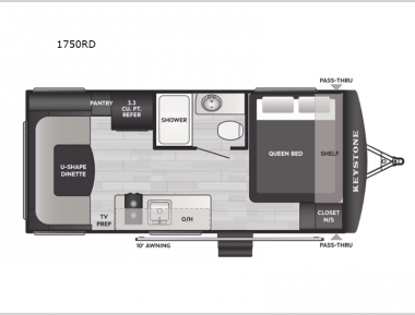 You will find lots of storage inside and outside this trailer allowing you to bring along everything you need for a great camping trip! Along the exterior there is a pass-thru compartment for your outdoor gear and a 10' power awning giving you a covered outdoor living area to enjoy. The cook will have a two burner gas range to make meals, and everyone can dine around the U-shaped dinette. There is a full bathroom to get cleaned up in before bedtime, and a queen bed to fall asleep quickly so you can have fun again tomorrow.