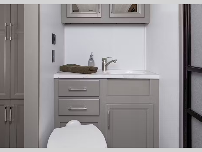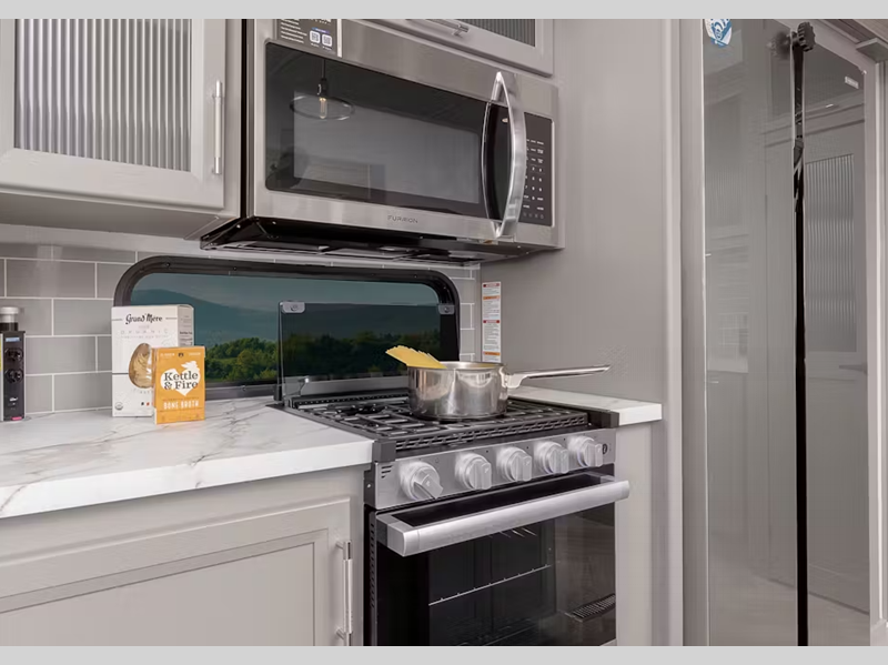 You will find Congoleum vinyl flooring with one-piece Dyna Span marine grade decking, residential style screwed and glued cabinetry, and designer upholstered window valances to make you feel right at home. The MaxTurn technology with Road Armor will make for smooth towing and the automotive-grade painted fiberglass front cap includes KeyShield protection for added convenience.