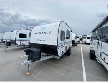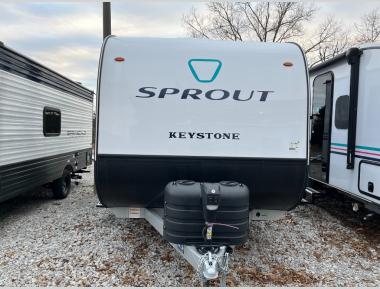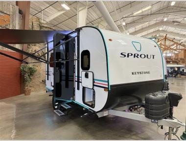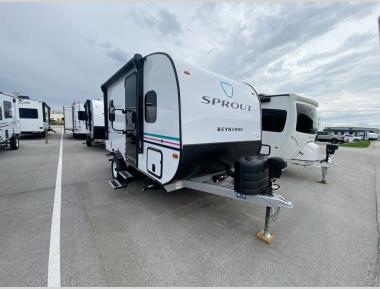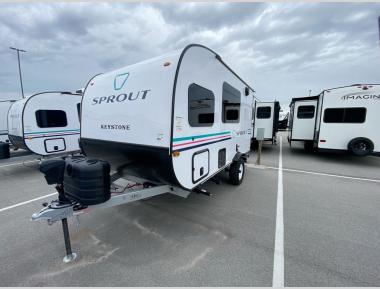 The Sprout travel trailers by Keystone are premium single-axle units that are sure to make an impression at the campground. Each one is built with .040 smooth front medal, one piece heated and enclosed underbelly, power tongue jack. There are also tinted safety glass windows, quick drop stabilizer jacks, and an exterior shower with hot and cold water. Inside, you will enjoy blackout night shades and a 78" interior height, along with an ultra-bright LED light strip and solid surface countertops in the kitchen. The 13,500 BTU A/C and 20,000 BTU furnace will keep you comfortable, and the Suburban tankless water heater is a convenience you won't want to camp without!