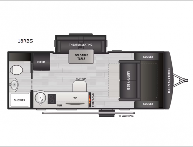 Sleeps 3 Length 17 ft 4 in Ext Height 10 ft 5 in Int Height 6 ft 6 in Hitch Weight 345 lbs Dry Weight 2950 lbs Cargo Capacity 1250 lbs Fresh Water Capacity 37 gals Grey Water Capacity 27 gals Black Water Capacity 27 gals Tire Size ST235/75R15D Furnace BTU 20000 btu Available Beds RV Queen Refrigerator Type 12V Refrigerator Size 4 cu ft Cooktop Burners 2 Number of Awnings 1 LP Tank Capacity 40 lbs. Water Heater Type Suburban tankless AC BTU 13500 btu TV Info LR TV Awning Info 9' Power Axle Count 1 Number of LP Tanks 2 Shower Type Standard