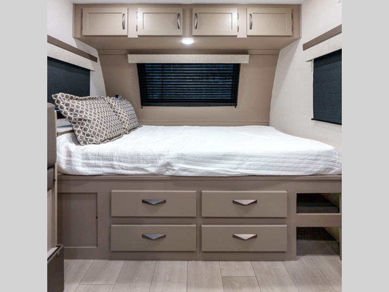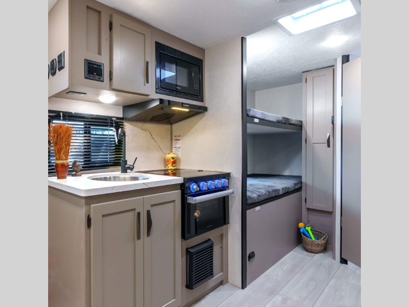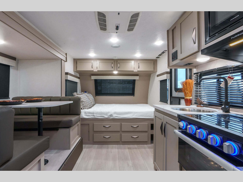 Sleeps 5 Slides 1 Length 22 ft 1 in Ext Width 7 ft 6 in Ext Height 10 ft 5 in Int Height 6 ft 6 in Interior Color Chocolate Hitch Weight 520 lbs GVWR 4800 lbs Dry Weight 4080 lbs Cargo Capacity 720 lbs Fresh Water Capacity 36 gals Grey Water Capacity 32 gals Black Water Capacity 32 gals Tire Size 15" Furnace BTU 20000 btu Number Of Bunks 2 Available Beds RV Queen Refrigerator Type 12V Refrigerator Size 8 cu ft Cooktop Burners 3 Number of Awnings 1 Axle Weight 3560 lbs LP Tank Capacity 20 lbs Water Heater Type Tankless AC BTU 13500 btu Awning Info 14' Power with LED Light Strip Axle Count 1 Number of LP Tanks 1 Shower Type Neo-Angled Similar Floorplans