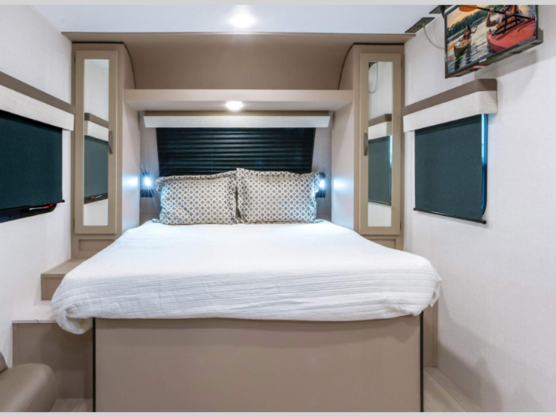 Some of the top features you'll enjoy are the molded fiberglass front cap with a windshield, the fully walkable roof with a ladder, and the exterior docking station. There is also a Key Alike program for the baggage and entry doors to keep your belongings secure plus flip-up entry steps, a Leash Latch with a bonus beverage opener, and more exterior conveniences. The seamless countertops inside will be easy to keep clean and the painted hardwood cabinet doors will make your space feel like home.