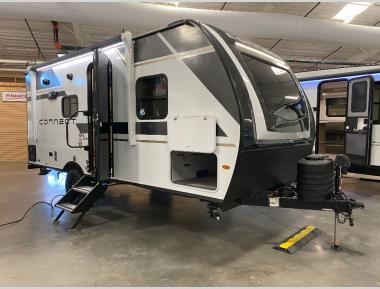 With any Connect Mini travel trailer by KZ, you will enjoy lightweight towing, interior comforts, and a price point you're sure to appreciate. Each model is constructed with durable 1-piece Tufflex material, 5/8" tongue and groove plywood flooring, and a molded fiberglass front cap with a windshield to let of your outdoor views in! You will love the look of the full glass friction hinged entry door, and the power awning with an LED light strip will provide a place to visit outdoors with friends and family. A hot and cold exterior shower also comes standard, along with a folding grab handle plus roof mounted solar prep and backup camera prep. Head inside to find residential grade linoleum, seamless countertops, roller shades, and painted hardwood cabinet doors. The 42,000 BTU tankless hot water heater will provide endless hot showers, and the low profile 13,500 BTU A/C will keep you comfortable during the summer!