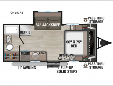 Sleeps 3 Slides 1 Length 22 ft 1 in Ext Width 7 ft 6 in Ext Height 10 ft 5 in Int Height 6 ft 6 in Interior Color Chocolate Hitch Weight 520 lbs GVWR 4800 lbs Dry Weight 3930 lbs Cargo Capacity 870 lbs Fresh Water Capacity 36 gals Grey Water Capacity 32 gals Black Water Capacity 32 gals Tire Size 15" Furnace BTU 20000 btu Available Beds RV Queen Refrigerator Type 12V Refrigerator Size 8 cu ft Cooktop Burners 3 Number of Awnings 1 Axle Weight 3410 lbs LP Tank Capacity 20 lbs Water Heater Type Tankless AC BTU 13500 btu Awning Info 11' Power with LED Light Strip Axle Count 1 Number of LP Tanks 1 Shower Type Standard Similar Travel Trailer Floorplans