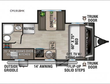 If you are looking for a little more sleeping space in a lightweight trailer, take a look at this Connect Mini. The 28" x 74" bunk beds will be perfect for guests or little ones, and the full bath is close by for easy nighttime use. You can take the front RV queen bed, and if you have any more guests, they can sleep on the booth dinette. A full kitchen, complete with a 17" oven and a microwave will let you cook breakfast each morning, and the radio included will let you listen to your favorite tunes. There is also an outside kitchen with a griddle and a refrigerator, exterior trunk doors, plus a 14' power awning with LED lights!