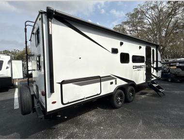 This travel trailer is the biggest in the Connect Mini lineup and you're sure to love it! There are double-size bunks for guests or little ones and a front RV queen bed for you! The slide out with a jackknife sofa and table will provide a place to relax and enjoy a meal together, and there is additional seating at the bar top with two stools. There is plenty of storage space found with this model, including dual bedroom closets, a pass-through storage, plus a pass-thru storage up front for fishing poles, hiking gear, and more! You will also love having an outside kitchen to cook meals when the weather is nice!