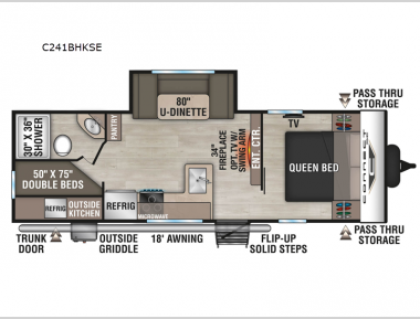 Get ready for outdoor fun at your favorite campground or RV park, and relaxation both outside and inside this trailer! The 18' power awning provides protection from the elements and the LED light strip allows you to stay up late, the outside kitchen and griddle provide amenities to make meals in the great outdoors, plus the trunk door and the pass-through storage give you access to stow items away. When you are ready to call it a night, there is a queen bed in the front private bedroom, double-size bunks next to the full bathroom, and a U-shaped dinette slide offers extra sleeping space. The next morning, the cook can make meals using the L-shaped kitchen with full amenities, or head back outdoors to use the outside amenities.