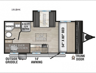 You're going to love camping in this spacious travel trailer that can sleep five people each night. When you arrive at your destination, set up the 14' power awning and start lunch on the outside kitchen with a griddle. The little ones will love the bunk beds, and you will have the front queen bed all to yourselves. This model also includes a full bath that will allow you to stay clean!