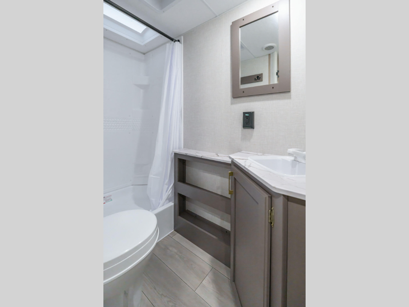 A tankless hot water heater will let you enjoy endless hot showers, and the RV Airflow A/C System with an air filter means you'll stay comfortable during the hot summer camping months. Each model also includes an aerodynamic front profile with a sleek smooth metal front, along with a two toned exterior metal that is sure to turn heads at the campground. There are seamless countertops with a stainless steel kitchen sink, residential grade linoleum, wider pocket/passage interior doors, plus many more comforts inside.