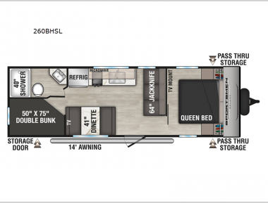 This travel trailer can comfortably sleep eight between the double-size bunks, the queen bed in the front bedroom, plus the booth dinette and jackknife sofa in the main living area. Everyone can freshen up each day in the full bath that includes a shower pan, foot flush toilet, and a sink. The chef of your group can make dinner on the cooktop or in the microwave oven, and there is a 10-cu. ft. 12V refrigerator for perishables. This model also includes a TV mount if you want to add a television for movie nights, and there is an exterior pass-through storage for fishing poles, camp chairs, and more!