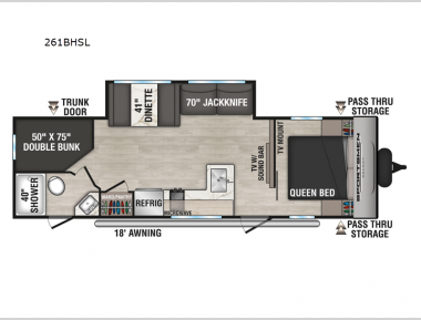 This bunkhouse model is perfect for your whole crew! Your guests or little ones will love the double-size bunks, while you take the queen bed in the front private bedroom. The large slide out will create an open living area, and here you'll find the 70" jackknife sofa and 41" booth dinette, both of which can also convert to extra sleeping space. The full bath has its own exterior entry door for convenience, and the second entry door opens up to the main living area. There is plenty of storage space in this model, including a wardrobe/pantry in the kitchen, dual wardrobes in the bedroom, an exterior pass-through storage, and even an exterior trunk door under the bunks to easily fit in all your gear!