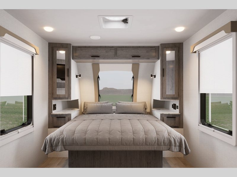 Sleeps 5 Slides 2 Length 29 ft 10 in Ext Width 8 ft 1 in Ext Height 10 ft 5 in Int Height 6 ft 8 in Interior Color Fog, Mink, Thunder Hitch Weight 905 lbs GVWR 8900 lbs Dry Weight 6400 lbs Cargo Capacity 2500 lbs Fresh Water Capacity 45 gals Grey Water Capacity 40 gals Black Water Capacity 40 gals Tire Size 225/75R15E Available Beds King Refrigerator Type 12V Double Door Norcold Refrigerator Size 7 cu ft Cooktop Burners 3 Number of Awnings 1 Axle Weight 5495 lbs LP Tank Capacity 5 gals Water Heater Type Truma AquaGo Axle Count 2 Number of LP Tanks 2 Shower Type Standard Similar Floorplans