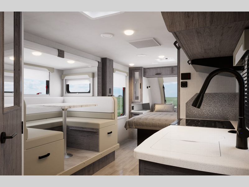 Each model is constructed with thermopane Euro windows, a molded fiberglass front cap, and Azdel interior panel walls for durability. There is Lite-Ply cabinet construction inside, along with Surf-X suedo solid surface lightweight countertops and tables, decorative backsplash, and many more interior comforts. Outside, the Keyed-Alike storage compartment doors will keep your gear secure and the exterior wash station will make it easy to wash off camp gear.