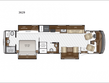 This coach is the perfect companion to take across states since it will feel just like home. There is a full-wall slide that will open up your living space, plus two additional slides so you won't feel confined. You will love the master bedroom and the full rear bath that includes a linen closet for clean towels, and there is a mid-coach half bath with an area for an optional Splendide stacked washer and dryer. The chef of your group will have a 30" convection microwave and a three burner cooktop to prepare meals each day, and there is a booth dinette (sleeper) where you can all dine together. You might want to relax on the sofa comfort lounge after dinner and watch a movie on the TV on power lift!