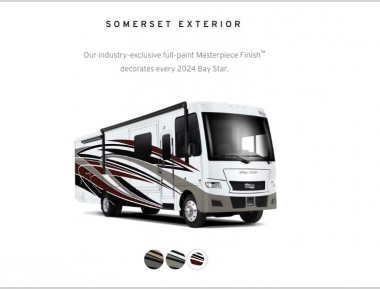 Each Bay Star Class A gas motorhome by Newmar delivers a smooth ride thanks to the standard electronic stability control, along with the 7.3-liter V8 engine with 335 HP and 468 lb./ft. of torque. The exterior is sure to turn heads with its full-paint Masterpiece Finish and new graphics packages, plus you'll have three interior decor choices and three wood choices to truly make the coach your own. Each model includes Williamsburg furniture, woven material in the slide outs, luxurious vinyl plank flooring, polished solid surface countertops in the kitchen, plus many more comforts. Head outside to find lights in the storage compartments, a 5.5kW Cummins Onan generator with remote switch, and hydraulic leveling jacks with a Bluetooth compatible touch pad for set up easy as 1-2-3! You can further customize your coach with the many options that are offered!