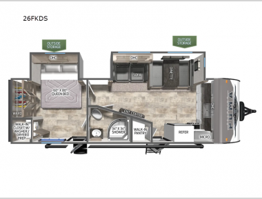 Sleeps 4 Slides 2 Length 30 ft 10 in Ext Width 8 ft Ext Height 11 ft 1 in Interior Color Cognac, Stone Hitch Weight 1035 lbs GVWR 8553 lbs Dry Weight 7053 lbs Cargo Capacity 1500 lbs Fresh Water Capacity 43 gals Grey Water Capacity 70 gals Black Water Capacity 35 gals Available Beds Queen Refrigerator Type 12V Black Glass Refrigerator Size 11 cu ft Shower Size 34" x 34" Number of Awnings 1 Water Heater Capacity 6 gal Water Heater Type Gas/Electric Awning Info 20' Electric with LED Lights Axle Count 2 Washer/Dryer Available Yes Shower Type Radius Electrical Service 50 amp Similar Travel Trailer Floorplans