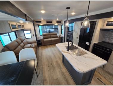 You're going to feel right at home in this travel trailer! The front private bedroom has a queen bed slide for a good night's rest, a dresser and front closet for your clothes, and another closet with washer and dryer prep. Freshen up each morning in the full bathroom with the 32" x 40" shower with a seat and then head to the kitchen to fry up some eggs on the stainless steel oven and range. You will also appreciate having a kitchen island for easier meal prep and a walk-in pantry to easily see your canned goods and snacks. The booth dinette offers a comfortable place to dine, play, and even sleep once converted. What better way to wind down your nights than to relax on either the rear sofa or in one of the two recliners across from the entertainment center with a fireplace!