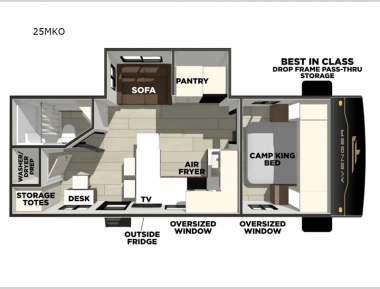 With any Avenger travel trailer by Prime Time RV, you will find innovation, a solid build, and comfort at every turn. Each model is built with Tuff Coat on the exterior metal, a fully enclosed underbelly, and a PVC roof membrane to help extend the life of your trailer. You will also find automotive name badging on the exterior, along with an exterior shower, front rail LED light strips, plus an XL padded entry grab handle to name a few conveniences. There are plenty of storage spaces inside, as well as Congoleum flooring and woven PVC marine grade slide out flooring, a designer shower surround, and seamless pressed countertops. You are sure to appreciate the onboard water filtration system, tankless water heater, plus 30K BTU furnace and 15K ducted A/C to help keep you comfortable.