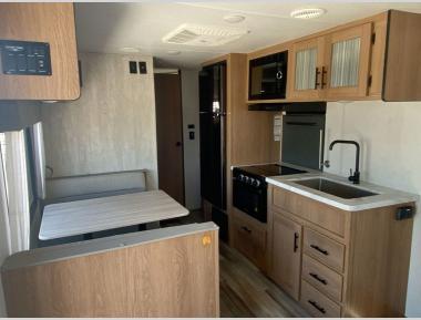 You will love spending time in this cozy travel trailer. The interior kitchen includes a three burner cooktop with a French door refrigerator and bottom freezer, and there is an exterior kitchen to cook outdoors when the weather is nice. With the inclusion of a walk-around queen bed in the front bedroom, plus the sofa and booth dinette in the combined kitchen and living area, and the double-size bunks, there is plenty of room to sleep eight or nine people each night.