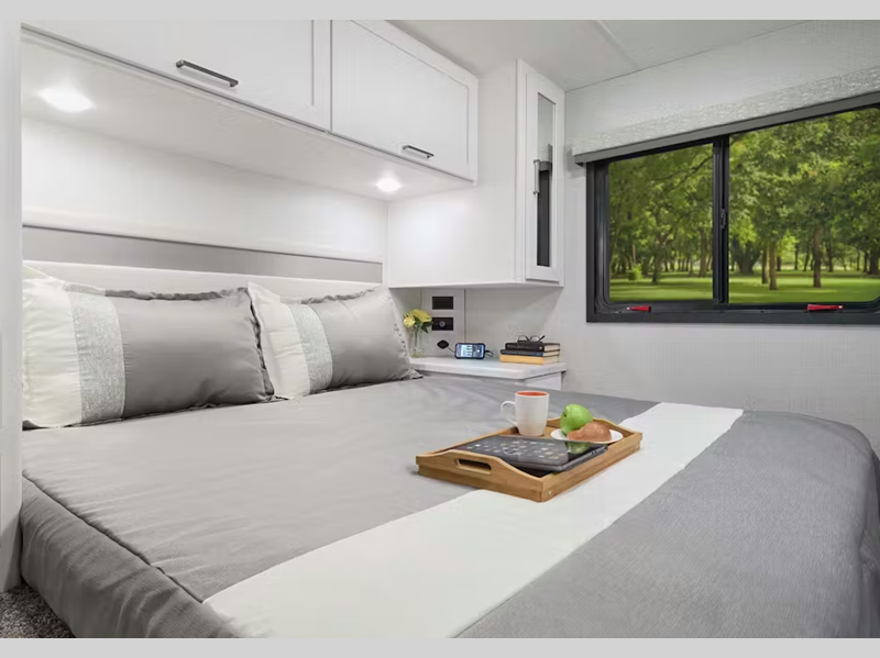 Sleeps 5 Slides 1 Length 26 ft 5 in Ext Width 8 ft 3 in Ext Height 11 ft Int Height 7 ft Interior Color Nantucket Blue ll, Sunlit Silver Exterior Color Standard Graphics Hitch Weight 8000 lbs GVWR 12500 lbs Fresh Water Capacity 41 gals Grey Water Capacity 33 gals Black Water Capacity 30 gals Furnace BTU 30000 btu Generator 4.0 kW Gas Dual Gas/LP Fuel Type Gas Engine 7.3L V8 Chassis Ford E-Series Horsepower 325 hp Fuel Capacity 55 gals Wheelbase 176 in Number Of Bunks 1 Available Beds Two Twin with King Conversion Torque 450 ft-lb Refrigerator Type 12V Convection Cooking Yes Cooktop Burners 2 Shower Size 27" x 27" Number of Awnings 1 LP Tank Capacity 40.9 lbs Water Heater Type Tankless AC BTU 13500 btu Basement Storage 65 cu. ft. TV Info Cab 32" Smart TV Awning Info 17' 6" Power w/Integrated LED Lighting Gross Combined Weight 18500 lbs Shower Type Radius Electrical Service 30 amp Similar Floorplans