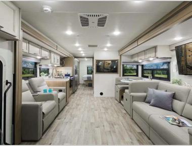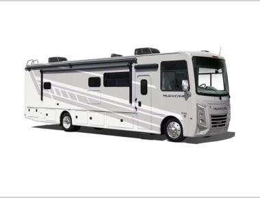 The Thor Motor Coach Hurricane is a Class A gas motorhome that sleeps six to nine people depending on the floorplan. In a Hurricane you can expect an 84-inch interior height, LED lighting and a ceiling ducted air conditioning unit. All of these motorhomes include a king-sized bed and a shower with a glass door for an at-home feel.
