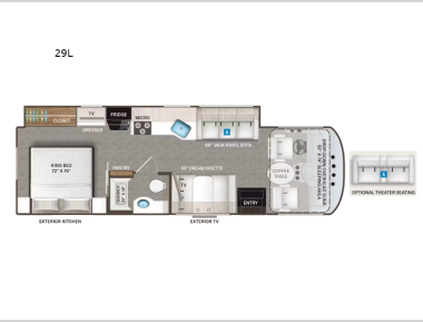 Family trips across the country are made complete in this spacious coach! The swivel captain's chairs can become a part of the living area once you park, and your guests can relax on the Dream Dinette or jack knife sofa. Lunch can be made on the three burner gas cooktop, or in the 30" over-the-range microwave oven, and clean up will be a breeze in the stainless steel single bowel sink. This model also includes an outdoor kitchen with a prep easily whip up meal. You will love having your own bedroom to retreat to each night, and here you'll find a king bed, a 32" LED Smart TV, plus a closet and dresser to keep your clothes and shoes tidy!