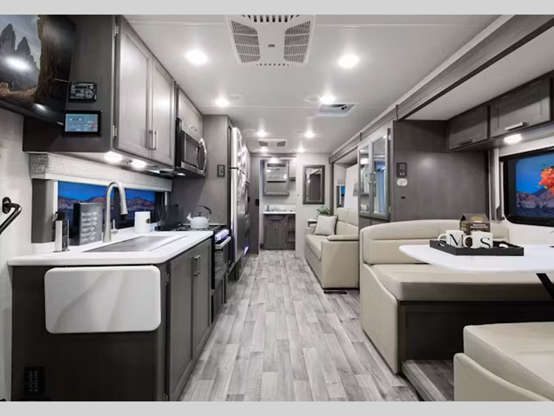 You will be able to tackle any adventure with the Power Stroke 4x4 turbo diesel engine and durable Ford F550 or F600 chassis, depending on the model you choose. There is also a 10,000 lb. or 12,000 lb. hitch to bring the family car along, plus added safety features such, as pre-collision assist and audible lane departure warning. Inside, the residential linoleum throughout will have you feeling right at home, along with Leatherette furniture, solid surface kitchen countertops, and a glass shower door in the bath.