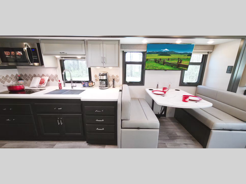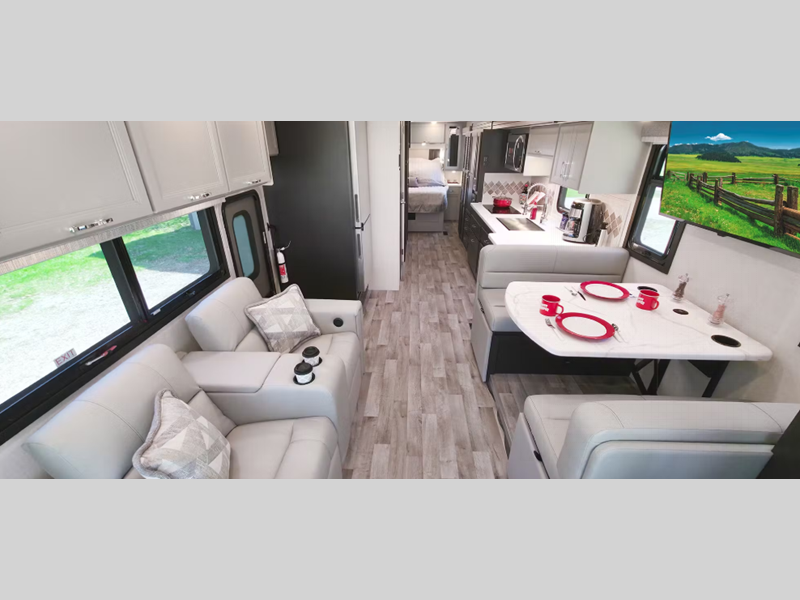 The Air-Ride suspension, the Sachs shock absorbers, and VFS front axle all work together to deliver unparalleled stability and control. There are ultimate camping conveniences from the inside out with features like the exterior 40" TV with Bluetooth-enabled soundbar, the easily accessible basement pass-through storage compartments so you can quickly grab a chair, an electric fireplace to warm up by on a chilly evening, and a Dream Dinette for a versatile, cozy experience.