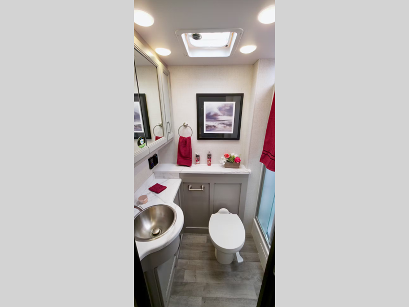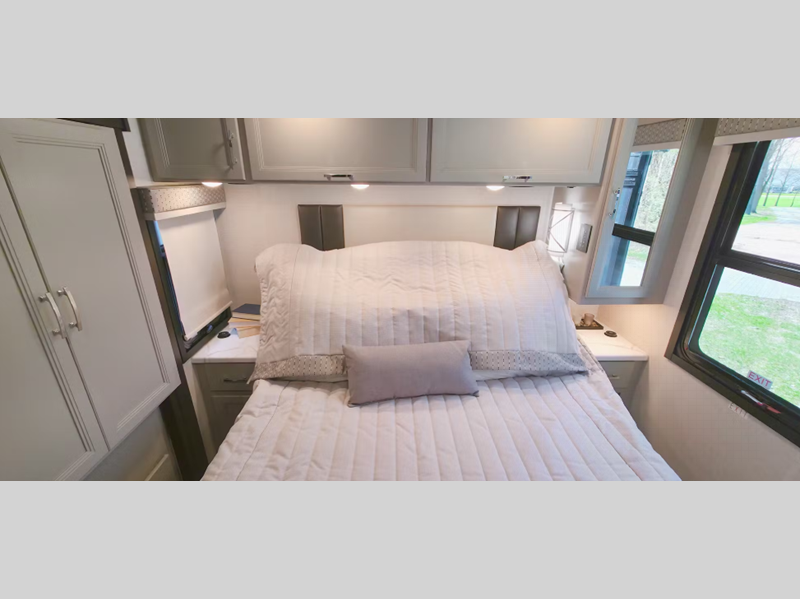 Sleeps 8 Slides 2 Length 34 ft 11 in Ext Width 8 ft 5 in Ext Height 12 ft 3 in Int Height 6 ft 10 in Interior Color Dovetail 2, Cashmere, Macaroon 2 Exterior Color Granite Point , Revel Blue, White Rock Hitch Weight 10000 lbs GVWR 26000 lbs Fresh Water Capacity 95 gals Grey Water Capacity 40 gals Black Water Capacity 40 gals Tire Size 255/70R 22.5 Furnace BTU 35000 btu Generator Onan RV QD 6000 Diesel Fuel Type Diesel Engine Cummins ISB 6.7L Chassis Freightliner XCS Horsepower 300 hp Fuel Capacity 90 gals Wheelbase 208 in Number Of Bunks 3 Available Beds Queen Torque 660 ft-lb Refrigerator Type Residential Convection Cooking Yes Cooktop Burners 2 Shower Size 30" x 36" Number of Awnings 1 LP Tank Capacity 105 lbs Water Heater Type On Demand AC BTU 27000 btu Basement Storage 126 cu. ft. TV Info LR 42" LED Smart TV, BR 32" LED Smart TV Awning Info 18' Power with Integrated LED Lighting Washer/Dryer Available Yes Gross Combined Weight 30000 lbs Shower Type Standard Electrical Service 50 amp Similar Floorplans