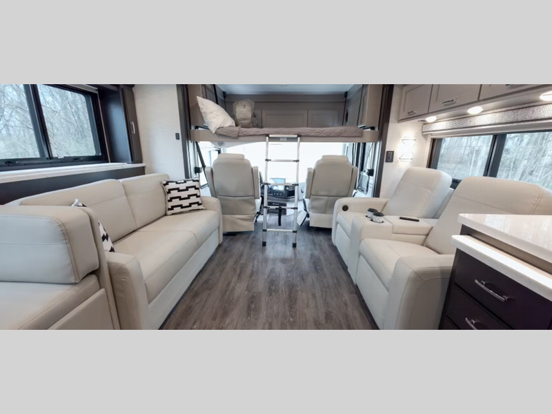 Sleeps 8 Slides 3 Length 39 ft 9 in Ext Width 8 ft 5 in Ext Height 12 ft 6 in Int Height 7 ft Interior Color Volero, Astrella 2 Exterior Color Full Body Paint; Cape Hatteras, Myrtle Beach, Rockingham Hitch Weight 10000 lbs GVWR 32000 lbs Fresh Water Capacity 95 gals Grey Water Capacity 40 gals Black Water Capacity 20 gals Tire Size 275/80R 22.5" Furnace BTU 35000 btu Generator Onan RV QD 6000 Diesel Fuel Type Diesel Engine Cummins ISB-XT 6.7L Chassis Freightliner XC-S Straight Rail Horsepower 340 hp Fuel Capacity 90 gals Wheelbase 266 in Number Of Bunks 3 Available Beds Queen Torque 700 ft-lb Refrigerator Type Side by Side Residential Refrigerator Size 19 cu ft Convection Cooking Yes Cooktop Burners 2 Shower Size 52" x 30" Number of Awnings 2 LP Tank Capacity 105 lbs Water Heater Type Tankless AC BTU 30000 btu Basement Storage 130 cu. ft. TV Info LR 42" LED Smart TV, BR 32" LED TV, Ext. 40" LED TV Awning Info 20' Power Lateral Arm w/Integrated LED Lights Washer/Dryer Available Yes Gross Combined Weight 33000 lbs Shower Type Standard Electrical Service 50 amp Similar Floorplans
