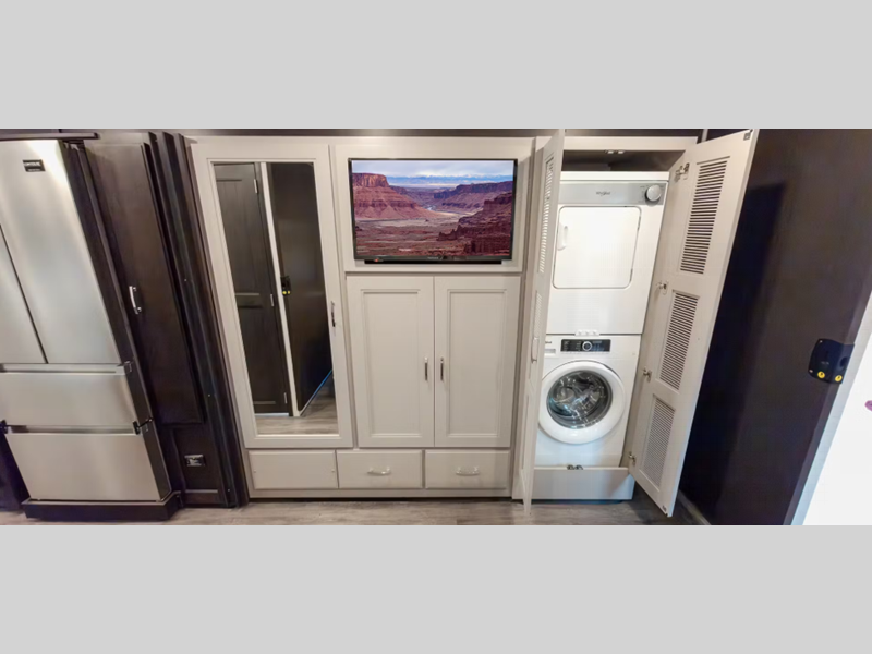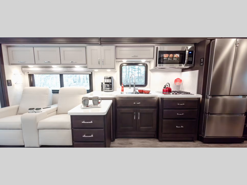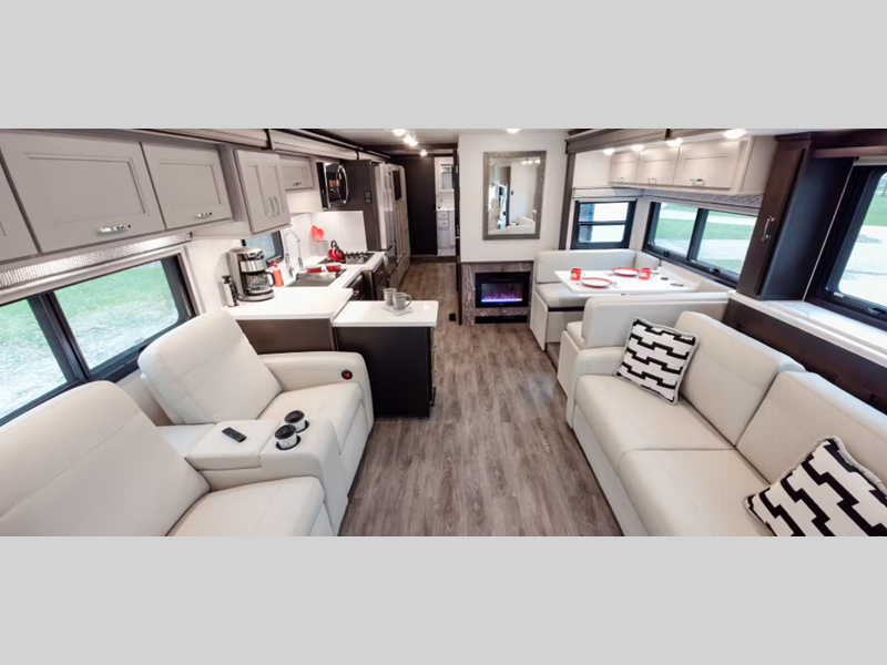 Sleeps 6 Slides 3 Length 34 ft 11 in Ext Width 8 ft 5 in Ext Height 12 ft 6 in Int Height 7 ft Interior Color Volero, Astrella 2 Exterior Color Full Body Paint; Cape Hatteras, Myrtle Beach, Rockingham Hitch Weight 10000 lbs GVWR 29500 lbs Fresh Water Capacity 95 gals Grey Water Capacity 40 gals Black Water Capacity 35 gals Tire Size 275/80R 22.5" Furnace BTU 35000 btu Generator Onan RV QD 6000 Diesel Fuel Type Diesel Engine Cummins ISB-XT 6.7L Chassis Freightliner XC-S Straight Rail Horsepower 340 hp Fuel Capacity 90 gals Wheelbase 208 in Number Of Bunks 1 Available Beds King Torque 700 ft-lb Refrigerator Type French Door Residential Refrigerator Size 15.7 cu ft Convection Cooking Yes Cooktop Burners 2 Shower Size 24" x 30" Number of Awnings 2 LP Tank Capacity 105 lbs Water Heater Type Tankless AC BTU 30000 btu Basement Storage 96 cu. ft. TV Info LR 50" LED Smart TV, BR 32" LED Smart TV, Ext. 40" LED TV Awning Info 20' Power Lateral Arm w/Integrated LED Lights Washer/Dryer Available Yes Gross Combined Weight 30500 lbs Shower Type Standard Electrical Service 50 amp Similar Floorplans