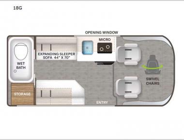Travel easily in this Rize 18G motorhome. When you are ready to get off the road for a few hours or several days you will have plenty of comforts to enjoy before you head to your next location. The expanding sleeper sofa offers plenty of seating during the day and additional seating can be found opposite with each seating area offering one set of seat belts for two rear travelers. Create meals on the go with a two-burner gas cooktop and microwave oven, you can dine while seated in one of the captain's chairs that swivel, or from the seating in back. Create a 44" x 70" sleeping space at night with the expanding sofa along the curbside. The large opening window above the sink and stove will provide plenty of fresh air throughout, and the wet bath in back is a convenience that you just can't beat while on the road or in camp!