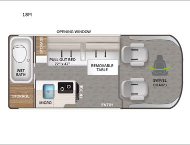 You can go wherever your heart desires with this motorhome! The rear wet bath adds comfort and convenience, plus there is storage to keep your towels close. You can prepare home cooked meals in the two burner gas cooktop or in the microwave oven, and there is a 12V electric refrigerator for food storage. The swivel captain's chairs are not only comfortable for driving, but also for socializing with guests. The 72" x 47" pull out bed has a removable table where you can dine or set your laptop up!