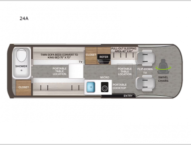 Hit the road in this coach that can sleep three each night. The captain's chairs up front swivel to provide more seating, plus you have twin sofa beds that convert to a king-size 75" x 70" bed to sleep on. The pull-out sleeping area up front converts to a 40" x 61" bed for a guest or two little ones. The portable cooktop allows you to make meals easily when stopped, and there is also a sink for cleaning up and refrigerator as well. You will find a 24" TV in the living area plus a front flip-down TV so you can enjoy a movie from anywhere in the coach! A wet bath in the very back allows all travelers to stay clean and fresh during the trip, and there is a bath closet to keep your clothing and personal items neat and tidy while you travel.