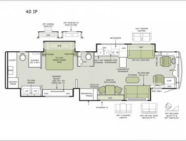 Sleeps 6 Slides 4 Length 41 ft Ext Width 8 ft 5 in Ext Height 13 ft 3 in Int Height 6 ft 11 in Interior Color Omnia, Pacifica, Taos Exterior Color Gen 13, Gen 15; Cinderwood, Arctic Sapphire, Frosted Granite, Waterfall, White Mahogany Hitch Weight 10000 lbs GVWR 42000 lbs Fresh Water Capacity 100 gals Grey Water Capacity 100 gals Black Water Capacity 55 gals Tire Size 315/80R22.5 Generator 10 kW Onan Quiet Diesel Fuel Type Diesel Engine Cummins L9 Chassis PowerGlide XC Raised Rail Rear Engine Horsepower 450 hp Fuel Capacity 150 gals Wheelbase 276 in Available Beds King Torque 1250 ft-lb Refrigerator Type Stainless Steel Residential with French Doors and Bottom Freezer Refrigerator Size 25 cu ft Convection Cooking Yes Cooktop Burners 2 Number of Awnings 2 Axle Weight Front 18000 lbs Axle Weight Rear 24000 lbs Water Heater Type Hydronic AC BTU 45000 btu Basement Storage 229 cu. ft. TV Info LR TV, BR 50" TV, Ext. TV Awning Info Girard Power w/LED Lighting, Manual Window Washer/Dryer Available Yes Gross Combined Weight 52000 lbs Shower Type Standard Electrical Service 50 amp Similar Motor Home Class A - Diesel Floorplans