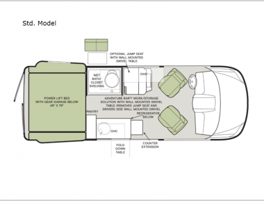 Pick a place, any place, and start packing. This off-road capable diesel van features a 49" x 79" gear garage beneath the power lift bed where you can store camp chairs, paddle boards for the lake, outdoor games and plenty of hiking gear. The on-board wet bath will keep you fresh and clean, and you can easily whip up meals and snacks in the kitchen with a single-burner induction cooktop and refrigerator beneath the counter for your perishables. There is also a sink for cleaning up and a removable counter extension. An optional jump seat and removable wall mounted swivel table behind the driver's seat can accommodate you for meals or a game of cards, or you can choose the optional adventure bar work/storage solution in place of the jump seat. Both front driver and passenger seats swivel to the back so you'll have plenty of seating even with company. At night, the power lift bed will allow you to get a great night's rest so you can enjoy it all again the next day!