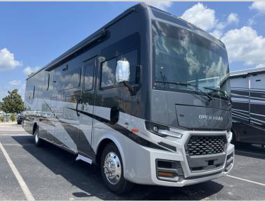 Sleeps 5 Slides 2 Length 37 ft 6 in Ext Width 8 ft 5 in Ext Height 12 ft 10 in Int Height 7 ft Interior Color Walkabout, Night Wanderer Exterior Color Gen 10 and Gen 12 Paint Schemes; Barcelona, Nasa, White Mahogany, Frosted Granite. G1 Mountainscape Hitch Weight 5000 lbs GVWR 26000 lbs Fresh Water Capacity 70 gals Grey Water Capacity 66 gals Black Water Capacity 50 gals Tire Size 255/80R22.5 Furnace BTU 50000 btu Generator 7.0 kW Onan Quiet Gas Fuel Type Gasoline Engine 7.3L V8 Chassis Ford F-53 Super Duty Horsepower 350 hp Fuel Capacity 80 gals Wheelbase 252 in Available Beds Queen Torque 468 ft-lb Refrigerator Type Stainless Steel Residential with Top Freezer Refrigerator Size 20 cu ft Convection Cooking Yes Cooktop Burners 3 Shower Size 28.5" x 40.5" Number of Awnings 1 Axle Weight Front 9000 lbs Axle Weight Rear 17500 lbs LP Tank Capacity 20.3 Water Heater Type Truma AquaGo Comfort Instant AC BTU 27000 btu Basement Storage 203 cu. ft. TV Info LR TV, BR TV, Ext. TV Awning Info Girard Side-Mounted Power w/Integrated LED Lighting Washer/Dryer Available Yes Gross Combined Weight 30000 lbs Shower Type Standard Electrical Service 50 amp Similar Motor Home Class A Floorplans