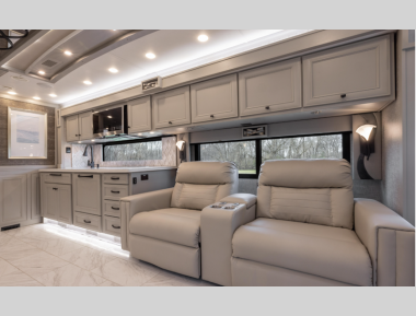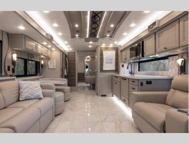 The Phaeton has a gross vehicle weight rating up to 45,600 pounds and a length up to 45-feet, depending on the model. The interior offers central vacuum cleaner, wardrobe with automatic light and LED lighting. All models feature hydraulic automatic leveling jacks, remote locking system for entry door and large tinted one-piece windshield.