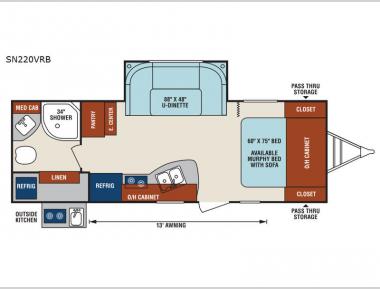Sleeps 4 Slides 1 Length 27 ft 1 in Ext Width 7 ft 6 in Ext Height 10 ft 4 in Int Height 6 ft 10 in Hitch Weight 520 lbs GVWR 5840 lbs Dry Weight 4940 lbs Cargo Capacity 900 lbs Fresh Water Capacity 36 gals Grey Water Capacity 30 gals Black Water Capacity 30 gals Tire Size 15" Furnace BTU 20000 btu Available Beds Murphy RV Queen Refrigerator Type Double Door Refrigerator Size 8 cu ft Cooktop Burners 3 Shower Size 34" Number of Awnings 1 Axle Weight 4420 lbs LP Tank Capacity 20 lbs. Water Heater Capacity 6 gal Water Heater Type On Demand Tankless Awning Info 13' Power with LED Lights Axle Count 2 Number of LP Tanks 2 Shower Type Radius Similar Travel Trailer Floorplans