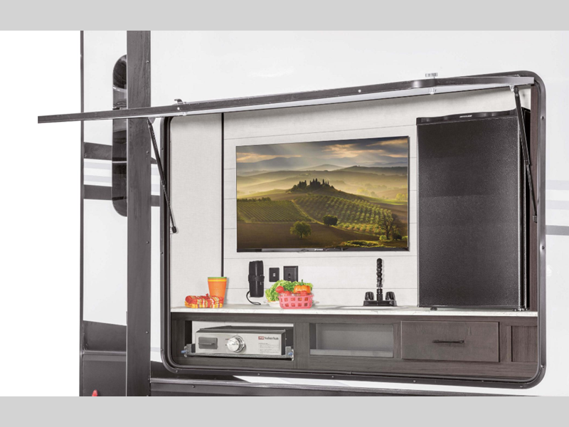 A PVC roof membrane covers protects the top of these units and a heated and enclosed underbelly protects the bottom. The RV airflow A/C system increases the 15,000 BTU air flow by an average of 40% for an improved performance, faster cooling time, and reduction of noise. You will also appreciate the 200W solar panel for off-grid capabilities, and the leveling system will have you set up at camp in no-time!