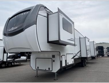 Sleeps 7 Slides 4 Length 39 ft 10 in Ext Width 8 ft Ext Height 13 ft 4 in Interior Color Blake, Doe Hitch Weight 2470 lbs GVWR 14995 lbs Dry Weight 12270 lbs Cargo Capacity 2725 lbs Fresh Water Capacity 76 gals Grey Water Capacity 50 gals Black Water Capacity 100 gals Tire Size 16" Furnace BTU 30000 btu Number Of Bunks 3 Available Beds King Refrigerator Type 12V Double Door Refrigerator Size 15.6 cu ft Cooktop Burners 3 Shower Size 30" x 48" Number of Awnings 2 Axle Weight 9800 lbs LP Tank Capacity 30 lbs Water Heater Type On Demand Tankless AC BTU 28500 btu TV Info LR LED Smart TV Awning Info 10' 4" & 18' Electric with LED Lights Axle Count 2 Washer/Dryer Available Yes Number of LP Tanks 2 Shower Type Shower w/Seat Electrical Service 50 amp Similar Fifth Wheel Floorplans