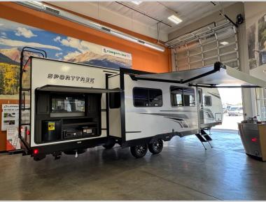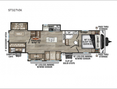Stay protected rain or shine with the two 10' legless awnings with wind sensors on this travel trailer! Some other exterior features you will enjoy include a campfire café with a 40" TV to watch the big game while you grill steaks on the griddle, and the pass-through storage area with slam latch baggage doors will keep your gear in place. Inside, there is a rear private bunkhouse with a closet, a 32" x 70" flip-up bunk above a 70" sofa with a table, and a 28" x 70" bunk above a 40" x 70" bottom bunk. The living area has a sofa across from an entertainment center with a frameless fireplace and a 40" TV with a swing arm so others can watch it from the Sit N' Slide table. The dual entry bathroom has a 34" radius shower to freshen up in, and is easy to access, especially those staying in the front private bedroom!